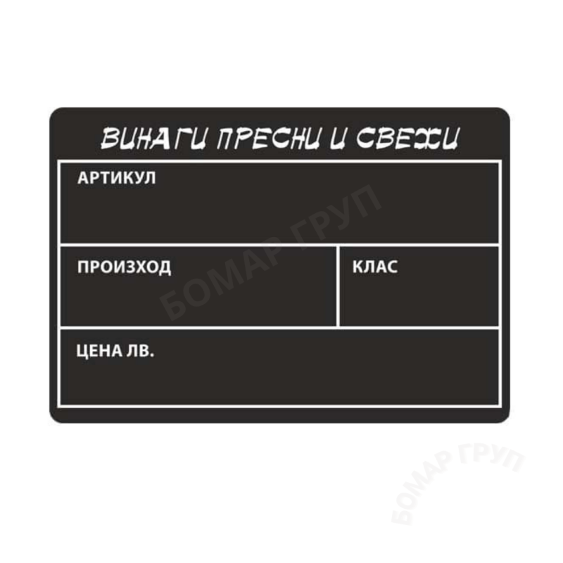 Черна табелка с размери 150 мм ширина и 100 мм височина е изработена от устойчив PVC материал, който гарантира дълготрайна употреба дори при интензивна работа в търговски обекти. Табелката е специално предназначена за маркиране на плодове и зеленчуци, като осигурява ясен и контрастен фон за всякакъв вид информация.