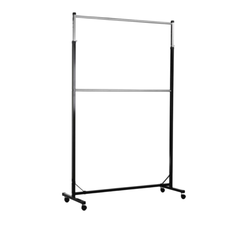Двоен щендер с регулируема височина, предназначен за търговски обекти, шоуруми, складове и домашна употреба. С размери 1250×500 мм в основата и височина от 1850 до 2150 мм, той предлага голяма площ за окачване на дрехи, като позволява подреждане в два реда – горен и долен.