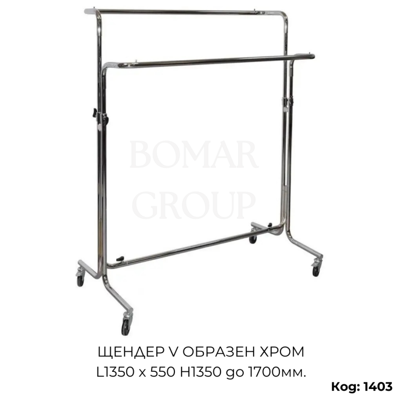 Метален V-образен щендер с регулируема височина, проектиран за удобна експозиция на дрехи и аксесоари в магазини, шоуруми и изложбени площи. С размери 1350 мм ширина, дълбочина 550 мм и регулируема височина от 1350 до 1700 мм, щендерът осигурява стабилност и оптимално пространство за подредба. V-образната форма позволява лесен достъп и отлична видимост на артикули от двете страни, което го прави предпочитан за ефективно представяне на текстилни изделия. Изработен е от здрав метал с хромирано покритие, което придава стилен и професионален външен вид, устойчив на износване и корозия.