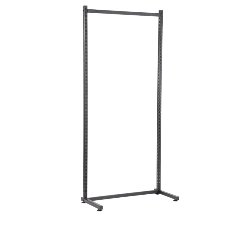 Щендер ПРО модел с черно матово покритие и стабилна конструкция с L-крак, проектиран за магазини, шоуруми и складове. С размери 1045×510 мм и височина 2265 мм, този модел е подходящ за окачване на по-дълги дрехи и аксесоари.