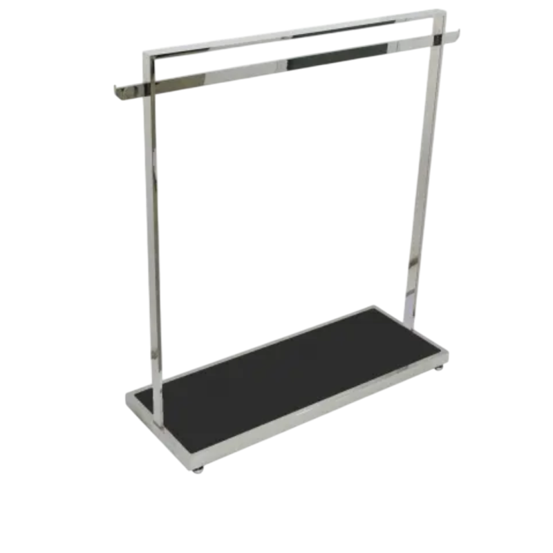 Щендер с черен МДФ и бастуни, проектиран за удобно и стилно представяне на дрехи и аксесоари в магазини, шоуруми или изложбени площи. Конструкцията е с размери 1200 мм ширина, 450 мм дълбочина и 1370 мм височина, допълнена с бастуни с дължина 1400 мм, които осигуряват повече пространство за окачване.