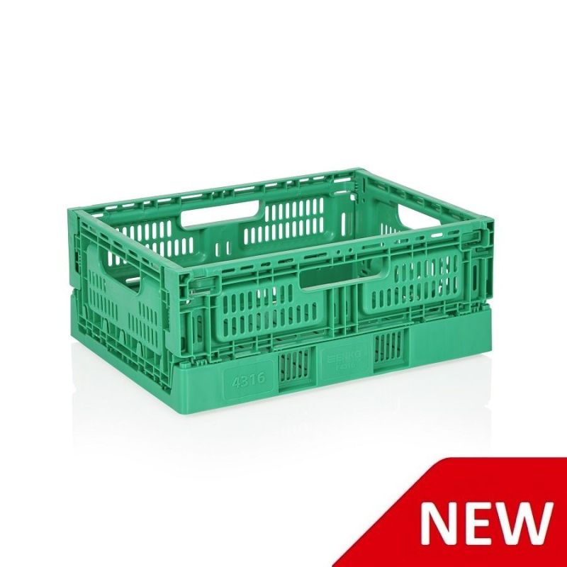 Сгъваема пластмасова каса с външни размери в разгънато състояние 400×300×155 мм и сгънато – 400×300×50 мм.