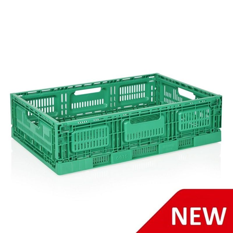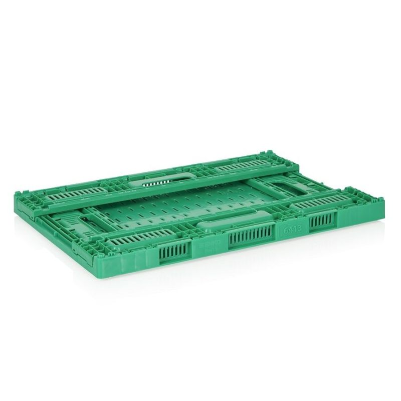 Сгъваема пластмасова каса с външен размер в разгънато състояние 600×400×155 мм и сгъната – 600×400×35 мм.