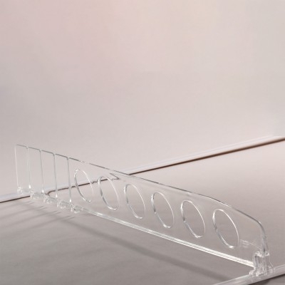 Разделител за рафтове с височина 50 мм и регулируема дължина 300–400 мм. Моделът е без преден стопер, което осигурява лесно изтегляне и достъп до продуктите в предната част на рафта. Прозрачният поликарбонат предлага добра видимост и устойчивост при ежедневно натоварване. Подходящ за организиране и отделяне на редове в търговски обекти, складове и хладилни регали.