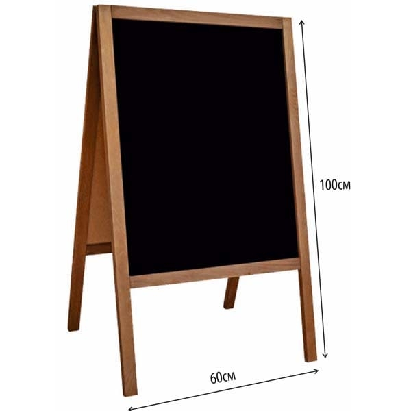 Сгъваема дървена табела тип А-борд с две черни двустранни плочи за писане – идеална за менюта, дневни оферти и съобщения пред ресторанти, кафенета и магазини. Голямата черна повърхност (60 × 100 см) осигурява отлична видимост, а гладкото покритие позволява бързо надписване и лесно почистване. Вградената верига-стопер стабилизира конструкцията и предотвратява прекомерно разтваряне при външна употреба.
