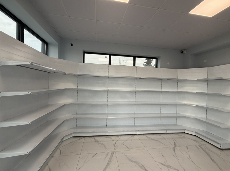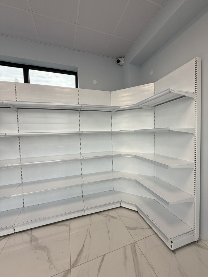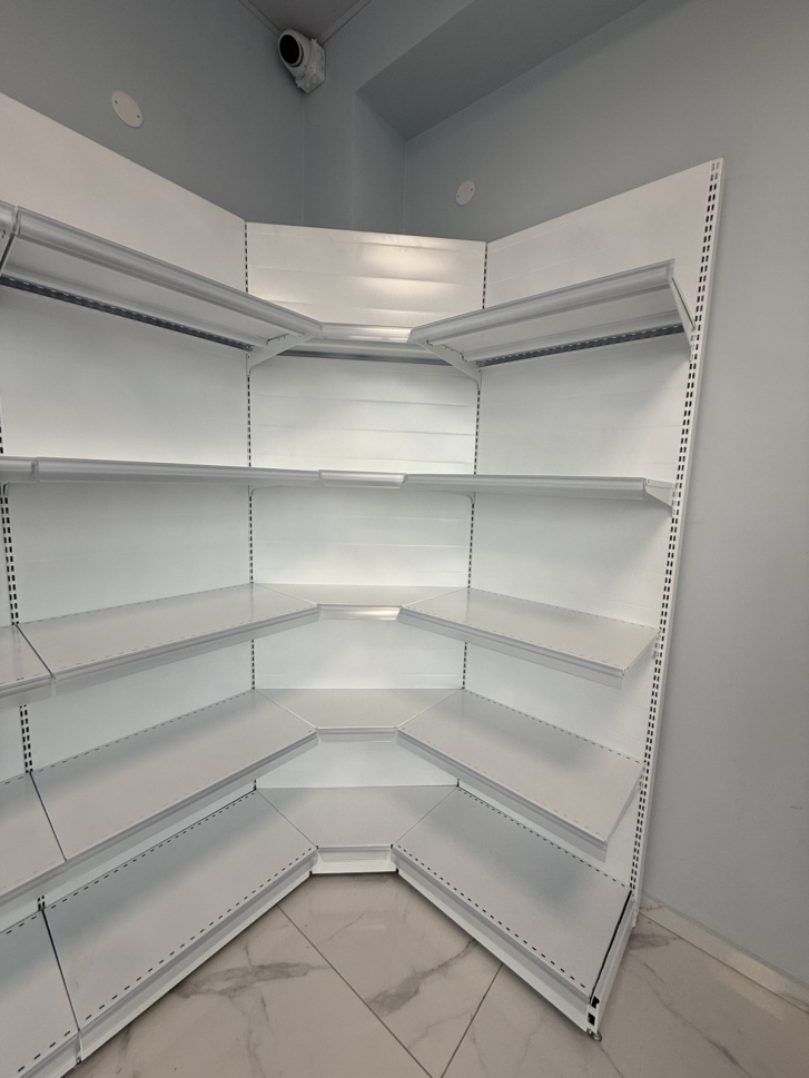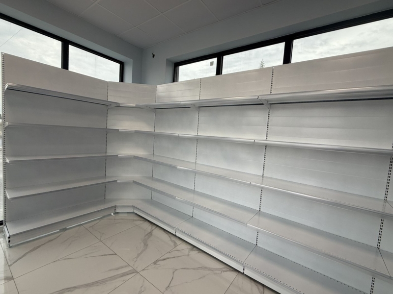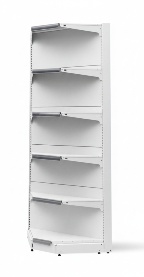 Максимално Усвояване на Пространството - ъгловият модул позволява да изградите непрекъснат стелажен ред, който се движи по периметъра на магазина, оптимизирайки всеки квадратен метър от Вашата търговска площ.