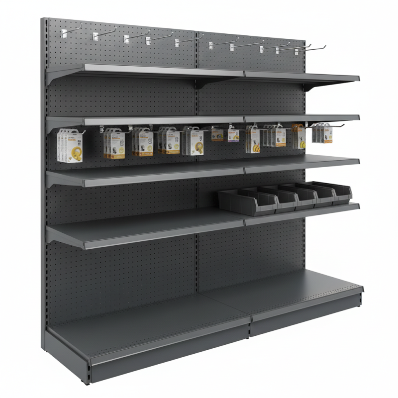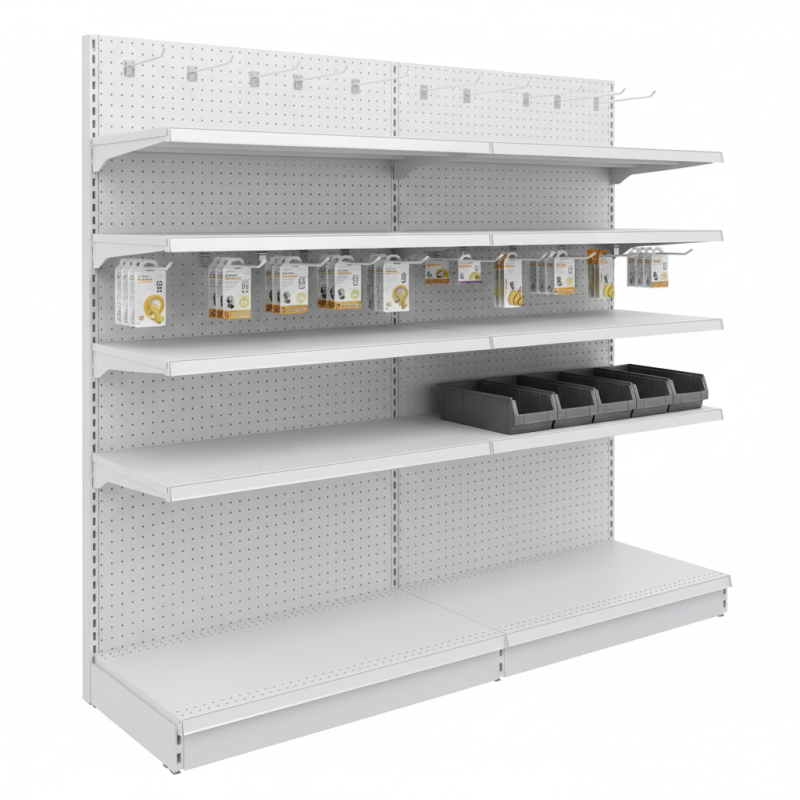 Представяме ви крайстенен стелаж с перфориран гръб – най-гъвкавото и адаптивно търговско оборудване, създадено за нуждите на всеки супермаркет, дрогерия, магазин за аксесоари или стоки за дома. Този модулен стелаж е проектиран да ви даде пълен контрол върху презентацията на вашата стока, като ви позволява да редувате окачване на продукти с традиционно излагане на рафтове.