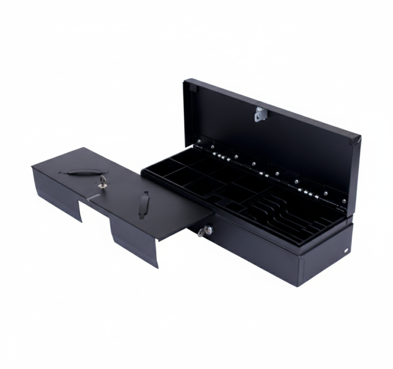 Този сейф съчетава сигурност, издръжливост и модерен дизайн в черен мат цвят. Външният му корпус е изработен от студено валцована стомана, а вътрешната каса е от пластмаса, гарантирайки дълъг експлоатационен живот, тестван до 1 000 000 употреби. Със своите компактни размери – Ширина: 46 см, Дължина: 17.2 см, Височина: 10.2 см – и тегло 4.3 кг, той заема минимално място на плота. Отварянето става чрез удобно електрическо управление с отварящ се капак, което ускорява транзакциите. Вътрешното пространство е оптимизирано с 2 фиксирани и 4 регулируеми отделения за банкноти, както и 1 фиксирано и 7 регулируеми отделения за монети. Чекмеджето предлага максимална гъвкавост за POS интеграция чрез различни опции за интерфейсен кабел (CR-2210B за принтер/Posiflex 12V/24V; CR-2214B сериен порт; CR-2215B/CR-2225B USB), което осигурява съвместимост с всяка търговска система. Инвестирайте във вертикална ефективност – перфектното решение за модерни търговски обекти, където всеки сантиметър има значение.